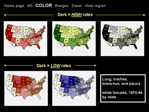 The user can choose from a variety of colors for the highest and lowest range of rates. The 3 maps in the first row are examples with dark colors for the high rates and light colors for low rates. The 2 examples in the second row show the opposite effect, I.e., light colors for the high rates and dark colors for the low rates. |