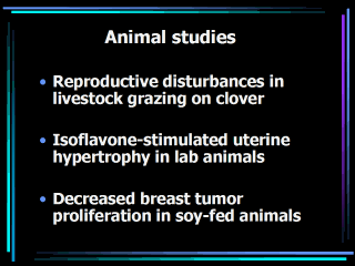 Phytoestrogens have been shown to produce reproductive disturbances in animals. Much of the original interest in phytoestrogens was prompted by the observation Of sterility and other reproductive problems in livestock grazing on clover. In Lab animals, isoflavones have been shown to stimulate uterine hypertrophy And decreased breast tumor proliferation has been observed in soy-fed animals. |