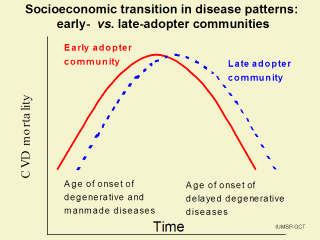 higher social and economic development: earlier rise and earlier decline of CVD Late adopters: when mediators of risk (process foods, cig, mechanized transport become mass produced for mass consumption (e.g. CVD & African-Americans) |