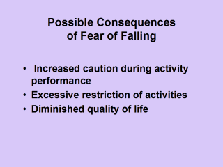 fear of falling has been described in seniors who live in the community. Range of consequences: -One consequence is increased caution during activity performance. By having some fear of falling, seniors may be more attuned to possible safety hazards and pay more attention to how they can move around safely in the environment. -Other consequences are the excessive restriction of activities and/or reduced quality of life. Since these consequences may threaten physical and mental well-being of seniors, we are more concerned about these effects. |