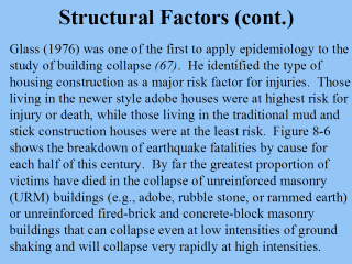 seismic safety. Concrete-framed houses are generally safer (i.e., less likely to collapse), but they are also vulnerable, and when they do collapse, they are considerably more lethal and kill a higher percentage of their occupants than masonry buildings. In the second half of this century, most of the earthquakes striking urban centers have involved collapses of reinforced concrete buildings, and the proportion of deaths due to the collapse of concrete buildings is significantly greater than earlier in the century (Figure 8-6). Reinforced concrete requires sophisticated construction techniques; however, it is often used in communities around the world where either technical competence is inadequate or inspection and control are lacking. Catastrophic failures of modern reinforced, concrete-slab buildings caused by the collapse of their supports have recently been described in Mexico City (1985), El Salvador (1986), and Armenia (1988) (72-74). Whereas the debris of buildings of adobe, rubble masonry, and brick can be removed with primitive tools, reinforced concrete poses grave problems for rescuers, particularly if not enough special and heavy equipment is available (48). |
