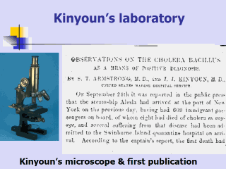 One of the instruments Kinyoun bought (and the only artifact remaining today) was a Zeiss microscope, the finest instrument available at that time and the product of 50 years of improvements in optics. Kinyoun’s first paper, "Observations on the Cholera Bacillus as a Means of Positive Diagnosis," indicated that the laboratory was viewed a a means to confirm clinical suspicions for ambiguous cases of cholera.