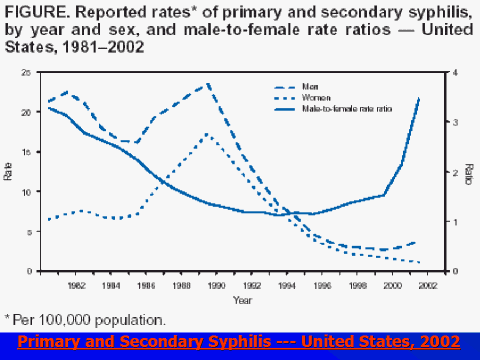 | This figure, from the MMWR of November 21, 2003, shows the changing male-to-female ratios of P&S syphilis in the United States over the past 2 decades. The current syphilis outbreak in the U.S. is largely among urban MSM. CDC noted that 2002 was the 12th consecutive year where P&S syphilis cases declined among women and nonHispanic blacks. |