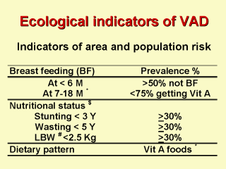populations at risk for vitamin A deficiency: When >50% of infants are not breast fed or when infants ages 7-18 months do not get at least 3 times/week vitamin A rich foods * $ Nutritional status is defined as measures <2 standard deviations of the WHO/NCHS standards: Stunting <2SD of height for age Wasting <2SD of weight for age # LBW low birth weight <2500 g * Dietary pattern when children do not get at least 3 times/week vitamin A rich foods