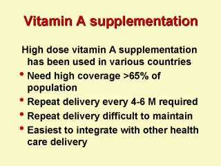Special programs: Philippines - biannual delivery of high dose capsules on special national days India - at 9-12 M give a high dose during measles immunization and every 6 M afterwards at regular checkups Bangladesh - Low dose supply 25,000 to 50,000 IU (international units) with routine immunizations in the 1st year of life and special days thereafter