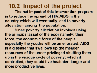 sustained economic growth and lower population growth. On the social environment, the stigma of the disease among the congregation members will be reduced and they will be more capable of helping AIDS orphans and PLWH. The involvement of AIDS orphans and PLWH as animators will greatly change the mentality of the local population, which no doubt, is another way towards better communication for behavioral change towards prevention of the disease. Development of the human resources of the clergy, AIDS orphans, PLWH, health staff, FBOs elders and members, local NGO partners, etc, in the execution, management and administration of HIV/AIDS projects will be reinforced. The project will ameliorate the living conditions of AIDS orphans and vulnerable children and PLWH and in the long term, amelioration of the productivity of the population, hence a contribution to poverty alleviation. |