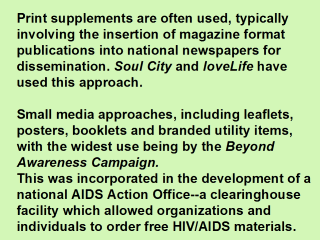 Helplines allows complex personalized interaction and discourse between target audiences and trained counsellors. CHAT can be so used. This includes the expansion and promotion of the national tollfree AIDS Helpline through the federal Beyond Awareness Campaign, the development of a women’s support line by Soul City, and loveLife’s Thetha Junction youth helpline. Community-based interactive approaches: for example, the development of the AIDS Memorial Quilt and AIDS Mural projects by the Beyond Awareness Campaign, and the event-based approaches to sports and healthful living promotion by loveLife. The Johns Hopkins University’s Center for Communications Programs Steps to Behavior Change model has been used. Read Piotrow, P.T., Kincaid, D.L., Rimon, II, J.G., Reinhart, W. 1997. Health Communication: Lessons for Family Planning and Reproductive Health. Praeger, New York. |
