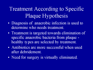 Diagnosis of periodontitis (the existence of the process of gum disease) is accomplished by of visual examination to detect signs of gingival inflammation, bleeding and damage to periodontal structures in the form of pockets around teeth and bone loss detected on radiographs. Diagnosis of anaerobic infection assesses who needs treatment. Treatment involves local debridement (scaling and root planing) followed by topical 0.5% iodine irrigation and/or systemic antibiotic treatment which helps select in favor of healthy bacteria and alters character of dental plaque to low risk profile. Recall the slide on infected vs. uninfected plaque. Debridement (scaling and root planing) should always precede the prescription of antibiotics as has been demonstrated by studies. The only time I will prescribe antibiotics prior to scaling is when the patient has acute periodontal abscess and the antibiotics serve to reduce the chance for bacteremia and/or acute exacerbation of infection. Infection control promotes excellent healing response and does not require surgery. Using these treatments virtually eliminates need for surgery. 33 |
