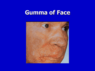 | A gumma is a nonspecific lesion, similar to a granuloma, that occurs in late syphilis. They are most commonly found in the skin, skeletal system, and mucocutaneous tissues, but may occur anywhere. They may be single or multiple. |