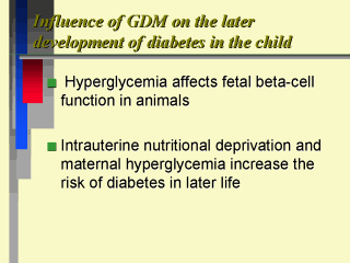 It was shown in animal experiments that maternal hyperglycemia has deleterious effects on the fetus. Moreover, a body of accumulated evidence supports the hypothesis that maternal hyperglycemia in humans, may lead to intrauterine malnutrition, and as a consequence, an increased risk of diabetes and cardiovascular disease of the offspring in later life. |