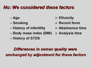 First, we examined a large number of characteristics of the man and of the semen sample, such as age or recent fever that have been associated with semen quality. But adjusting for these potential confounders caused little change in the amount that semen quality differed between centers. Therefore, confounding does not appear to be a likely explanation for our findings.