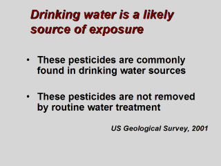Since these pesticides have been found at high levels in drinking water sources in the mid-West, and because these are not removed by routine treatment of drinking water, water is a likely source of exposure. |