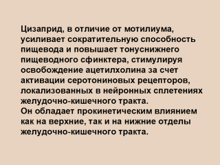 а также назначение препаратов, ингибирующих CYP3A4 (антибиотики-макролиды, ингибиторы ВИЧ-протеазы и др.), удлиняющих интервал Q-T (антиаритмические препараты, антидепрессанты), антипсихотических (фенотиазины, пимозид и сертиндол) и антигистаминных (терфенадин). Все перечисленное ограничивает использование цизаприда в широкой клинической практике. Монотерапия прокинетиками используется в виде курсов как при отсутствии, так и при наличии рефлюкс-эзофагита, кроме того, возможен однократный прием этих препаратов "по требованию". |