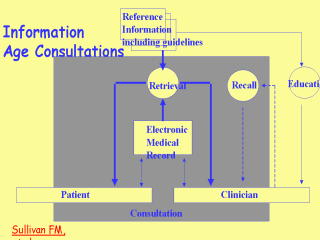 This interaction between reference information and the clinical record mediated by the primary care clinician is the information age consultation. Its other potential is that patients could obtain information before, or after the consultation, not just when seeing their GP. |