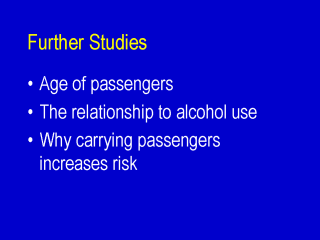 We know that the passengers in their 20s will increase the chance that a crash will be fatal to teenage drivers. However, we do not know whether passengers in their 20s will increase or decrease the risk of being involved in a crash for teenage drivers. This information is essential for forming passenger restriction laws, since most of the passenger restrictions in the United States have exceptions for passengers older than 21. Also, the studies will help us to explain the role of alcohol in the relationship between teenage driver crashes and why carrying passengers will increase the crash risk for teenage drivers will be needed.