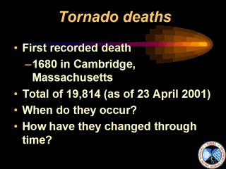 More than 18 000 people died in tornadoes in the United States from 1875 to 2000. The rate of death has been decreasing since 1925 from about 1.8 per million per year to 0.12 per million per year. This has resulted both from fewer killer tornadoes and from a decrease in the number of deaths in the largest-fatality tornadoes. |