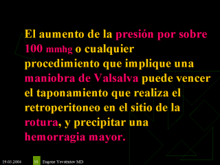 | El aumento de la presión por sobre 100 mmHg o cualquier procedimiento que implique una maniobra de Valsalva, como la instalación de SNG, sonda Foley, etc., puede vencer el taponamiento que realiza el retroperitoneo en el sitio de la rotura, y precipitar una hemorragia mayor. |