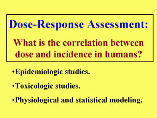 The main objective of dose-response assessment is to describe the quantitative relationship between the amount of exposure to an agent and the extent of an adverse response (e.g., between dose and incidence). The harmful response is known as a non-threshold effect if it can be thought of as caused by a single or short exposure. A familiar example of this type is lung cancer caused by even passive inhalation of cigarette smoke by nonsmokers. It has been shown (Doll, 1978) that the annual incidence of lung cancer in cigarette smokers correlates well with number of cigarettes smoked per day. There is the notion, however, that even very small amount of exposure to cigarette smoke is capable of initiating the multistage process of (lung) cancer. As supported by other epidemiological and animal data, several other types of cancer (e.g., radiation-based) are also thought to fall into this non-threshold category. At the low-dose region, for which experimental data are usually not available, the incidence (i.e., the response) can be extrapolated only through use of some physiological or statistical modeling. This type of extrapolation is needed in that the ultimate goal of public health is to protect as many people in a community as possible, including even those exposed to very low dose. Models that support a threshold effect are also used for incidence extrapolation at the low-dose region, but typically for non-cancer type adverse response such as cholinesterase inhibition or reduced fertility. In this type of dose-response curves, it is assumed that no toxicological response occurs until a certain dose threshold is reached. |