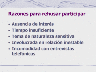 1. ¿Por qué no aceptaron participar? 2. ¿Cual es su ocupación? 3. Años de educación. Las razones para rehusarse fueron rankeadas en el orden de más a menos frecuentes respuestas. |