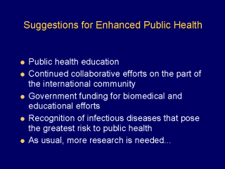 In order to combat emerging infectious diseases, a number of public health measures must be augmented or continued. At the forefront of prevention is public health education. Members of the global community should be educated about EIDs as well as vaccinated against them where possible. Nations of the world should also pool their financial as well as academic resources. Finally, additional governmental funding should be offered to combat the threat of emerging infectious diseases.