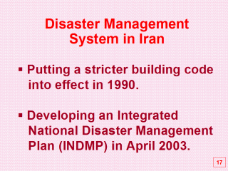 building code was put into effect in 1990 in the country. With support from UNDP, an INDMP was developed and was approved by Cabinet in April 2003. It provides a framework for emergency management at the national, provincial and local levels during preparedness, mitigation and recovery phases. Yet despite the serious effects of natural disasters on the sustainable development of the country, the existing governmental and non-governmental bodies have focused mostly on relief and response. Little attention has been paid to disaster risk management. |