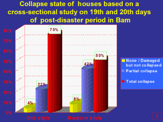 This slide presents the collapse state of earthquake-stricken population houses based on the cross-sectional study. I hope you have seen the slide 20 in part 5. In spite of the mentioned selection bias, as it is expected, the total collapse proportion of old style buildings was higher than modern style ones. |