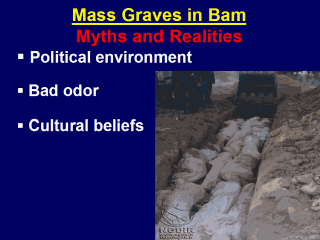 ![]() You see the pictures of mass graves in Bam. Actually it is a myth that corpses left on the ground can cause outbreaks. Although, health officials know that well, but they were obliged to do that because of local limitations including: the sensitivity of authorities to odor of corpses, and religious beliefs of people that corpse should not be left on the ground. The consequences of this fact are future legal problems and psychological problems for mourners. |