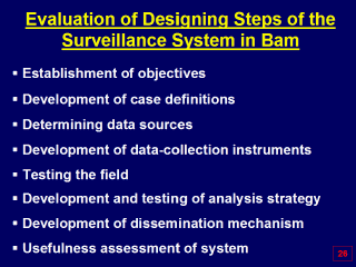 | The disease surveillance system in Bam has some strong and weak points as well. So to be brief, I can say that mentioned steps on the slide are, to some extent, taken into consideration, but still each of them needs further formal evaluation. |