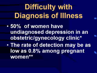 recognized by the physician. References for Rates of undiagnosed depression: *Yonkers KA, Chantilis SJ (1995). Recognition of depression in obstetric/gynecology pratices. American Journal of Obstetrics and Gynecology, 173:632-638. **Marcus SM, Flynn HA, Blow RC, Barry RC (2003). Depressive symptoms among pregnant women in obstetric settings. Journal of Women’s Health (Larchmt) 12:373-380. |