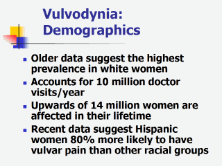 affect women of all ages and ethnicities. Vulvodynia accounts for 10 million doctor visits/year. Upwards of 14 million women are affected in their lifetime. 40% of women with vulvodynia choose not to seek treatment (2). Of those seeking treatment, 60% see three or more clinicians (2). Of women seeking treatment, the majority of clinicians do not provide a diagnosis to the woman (1). |
