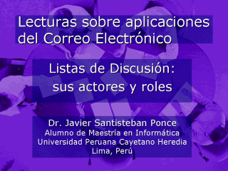 Desde 1993 el autor ha sido miembro de diversas listas de discusión médicas por correo electrónico, y desde 1997 asumió el rol de moderador de varias listas de discusión y administrador de listservers. Esta es una serie de diapositivas sobre la forma en que funcionan las listas de discusión por correo electrónico, cómo suscribirse a ellas y cómo hallarlas en los temas de interés particular.