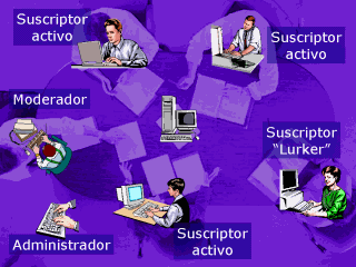 Cada uno de ellos pueden estar a miles de kilómetros de distancia uno del otro, esto no interesa cuando se trata de mantener un grupo de discusión por correo electrónico… Pero siempre se requiere un SERVIDOR (otra vez lo de la bendita plataforma cliente-servidor…) esta vez se trata de un SERVIDOR DE LISTAS DE DISCUSION ó llamado comunmente LISTSERVER (colocado al centro de la mesa en la foto), el cual puede estar a miles de kilómetros de los computadores de los miembros. Notarán que ese LISTSERVER no tiene a ninguna persona cerca… pues normalmente un LISTSERVER puede ser controlado a distancia, mediante órdenes que se le envían por correo electrónico a una dirección especial. El LISTSERVER toma esas órdenes y las procesa. Quien tiene acceso físico cercano al LISTSERVER es generalmente el ADMINISTRADOR, pues el MODERADOR puede estar muy alejado del LISTSERVER como cualquier otro SUSCRIPTOR. |