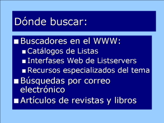 Búsquedas en el WWW, que pueden hacerse en catálogos de lsiats de discusión, interfases de búsqueda de los mismos LISTSERVERS, o bien en catálogos de recursos especializados en el área específica. Búsquedas mediante comandos de correo electrónico enviadas a los listservers Búsquedas en artículos de revistas especializadas y en capítulos de libros sobre el tema Pasaremos a discutir cada una de las opciones...