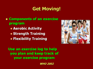 | To improve physical fitness, the body must be challenged by loads greater than normal. For example, when muscles are stressed by a greater load than they are used to, they adapt and their function improves. This principle applies to aerobic activity, strength training, and flexibility. |