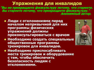 Необходимо включать инвалидов во все планируемые и проводимые общественные программы по физкультуре. |