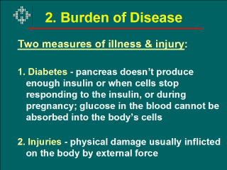 the condition, as well as the number of people affected by the condition Two main conditions used in this study - diabetes and injury - are known to be significant problems among First Nations. Definitions:(validated by comparisons with surveys & clinical data) Newborn hospitalizations with E-Codes & brain deaths were excluded. |