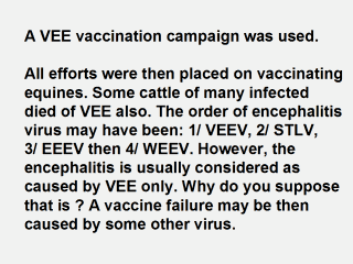 It takes MUCH MORE THAN THIS for equine protection, vector control and snuffing out a virus outbreak. This can be done with a ring like 100-300 km of the correct vaccine in equines. Now if the plan is not working (dead horses are seen), although vaccine was given over one month before the arrival of this invading virus, "WE" have the wrong vaccine. OUR information is out-of-date. WRONGWAY VACCINATIONS have happened repeatedly because the antigens needed to identify a new strain or monitor an old one was not available. Add "No Sentinels" |