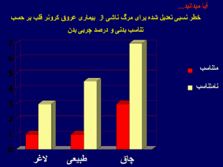 بر اساس مطالعه Steve Blair از Cooper Institute تگزاس، نسبت خطر برای ابتلا به بیماری قلبی عروقی در افراد غیر متناسب فیزیکی و چربی بالا بیشتر بود(1.39 و 0.1< P)، (1.53 و 0.05> P) و (1.95 و 0.05> P) . نسبت خطر مشابه برای وقوع مرگ (تمام علل) در مردان مشاهده شد (1.25،1.44،1.49 به ترتیب برای گروهها با 0.05> P). همچنین این نسبتهای خطر برای وقوع مرگ (بدلیل بیماری قلبی عروقی علل) در مردان مشاهده شد (1.39 و 0.06> P)، (1.55 و 0.06> P) و (1.67 و 0.05> P). در این مطالعه، فعالیت بدنی پیش بینی کننده مرگ نبود. Blair SN: Cin J Sport Med. 2003 Sep;13(5):319-320 |