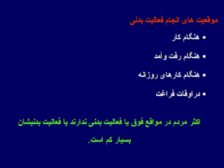 موقعیت هایی که مردم میتواننددر حین فعالیت های روزمره به انجام فعالیت بدنی بپردازند در 4 حیطه کلی است: - هنگام کار: مثلا در شغلی که نیازمند تلاش های بدنی است. - هنگام رفت وآمد: مثلا هنگام رفتن به مدرسه، محل کار، خرید و ..... - هنگام کارهای روزانه: مثل کارهای خانه، رسیدگی به باغچه یا سایر موارد - در اوقات فراغت: مثلا با انجام ورزش، نرمش یا فعالیت های تفریحی علیرغم موقعیت های فراوانی که برای مردم برای انجام فعالیت بدنی در حین زندگی رورمره در انگلستان وجود دارد، اکثر آنها در مواقع فوق یا فعالیت بدنی ندارند یا فعالیت بدنیشان بسیار کم است. |