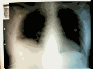 chest X-ray of the patient with pulmonary with CTEPH before and after PTE. A chest x-ray will usually show hilar fullness attributable to the engorgement of the central pulmonary arteries, clear lung fields, and right ventricular enlargement.