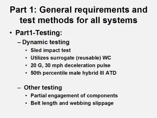 | Testing of the wheelchair tiedown devices involves a simulated ( impact sled) crash test using a surrogate (simulated standard) wheelchair with a mass of 185 lbs. In the suurogate wheelchair seat is placed an anthropometric test dummy ( ATD) with a mass distribution representing that of the average male, 75kg(168lbs). The secured wheelchair and restrained ATD is then subjected to a 20g, 48kph (30mph) simulated crash. |
