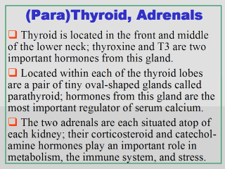 thyroid-stimulating hormone. Located within each of the thyroid lobes are (usually) a pair of tiny oval-shaped glands that function together called the parathyroid glands. With the aid of calcitonin secreted by the thyroid, the parathyroid hormone secreted by these parathyroid glands is the most important endocrine regulator of calcium levels in the blood and in the extracellular fluid. The two adrenal glands are triangular in shape, with each situated atop of each kidney. Each adrenal gland’s outer part is called adrenal cortex whereas its inner part, adrenal medulla. The adrenal cortex produces the corticosteroid hormones, which play an important role in metabolism, the immune system, certain aspects of behavior, and sexual function. These corticosteroids include aldosterone, hydrocortisone, and adrenal androgens. The adrenal medulla secretes norepinephrine and epinephrine to aid the body in dealing with stress. Both of these catecholamine hormones are associated with higher blood pressure and heart rate. |