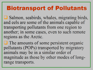 estimated for atmospheric and oceanic transports. In an earlier study by Comba et al. (1993), an effort was made to quantify the transport of the pesticide mirex from Lake Ontario to the St. Lawrence river system. The authors estimated that, for the time period 1950 to 1990, 290 kg of mirex were transferred downstream with water and sediments, and another 60 kg by migrating eels, thus suggesting that biotransport was of a similar order of magnitude as the transports in abiotic media. In still an earlier study, Lum et al. (1987) concluded that eels transferred more mirex out of Lake Ontario than what these creatures did to suspended particulate matter. According to the United Nations Environment Programme (UNEP, 1998), each year a fair number of the migrating birds die in their winter quarters in the warmer southern regions. These birds thus are likely to leave a considerable amount of POPs in their winter quarters that their bodies have accumulated from their northern summer quarters prior to migration. |