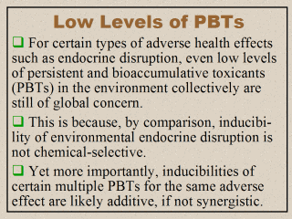 in this field. The discussion in the literature on persistence, bioaccumulation, and toxicity thus far links to adverse health effects in general more than to endocrine disruption. Yet frankly, this lecture has a strong bias towards the latter. In fact, its ultimate goal is to serve as one of the few places that have specifically recognized the health impacts of persistent, bioaccumulative, and toxic (PBT) pollutants present at low concentrations in the environment. For certain types of adverse health effects such as endocrine disruption in particular, even low levels of PBTs in the environment collectively are still of global concern. There are at least two reasons for such a concern. First, by comparison with other types of adverse health effects, the inducibility of endocrine disruption is not chemical-selective. Second and more importantly, until proven otherwise, the inducibilities of some multiple PBTs are likely additive, if not synergistic. In other words, if two PBTs are antiandrogenic even if they are chemically very different or if they reside in separate places or media, the antiandrogenic effects from subsequent exposures to both of these endocrine disruptors are likely cumulative. It is based on this premise that, for many environmental pollutants, both persistence and bioaccumulation are said to play an important role in endocrine disruption. |