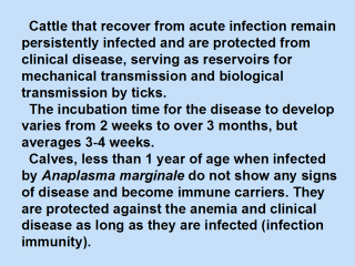 Once infected, these cattle will be carriers of A. marginale for many years if not life. These animals can serve as a source of infection for other cattle. These cattle are infected carriers and do not develop signs of disease. Occasionally, however, some animals spontaneously clear them-selves completely of the infection and become as susceptible to the disease as they were originally. Necropsies will generally show a markedly anemic and jaundiced animal with thin watery blood. The spleen usually is enlarged and soft with prominent follicles, while the liver appears mottled and yellow-orange. The gall bladder is often distended. The bile appears thick greenish brown. The hepatic and mediastinal lymph nodes are likely brown. |