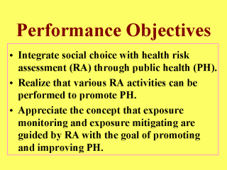 not advance much in many underdeveloped countries. From learning the various example activities of RA highlighted here, you the students should realize that not all health agencies have the same interest or resources to perform all components of the RA process in fulfilling their PH mission. In addition to social choice or political values, the impact of industrialization and economic development on health is also important, especially in developing and industrial countries. In these more advanced countries, RA and EHIA activities are closely related. At the end of this lecture, you the students should be able to accept that the outcomes of an RA can and should be used as the basis for reducing the health risk involved. The most effective approach to reducing health risk is to monitor and mitigate the population’s exposure to the toxic agent at issue. |