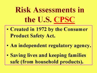 extractor. It also offers safe tips for sleeping babies. Empowered by the older Federal Hazardous Substances Act (FHSA), CPSC regulates consumer products that generate pressure or that are combustible, toxic, corrosive, or radioactive. Its means of product regulation is primarily through label warnings. In terms of health risk assessment (RA) activities, CPSC apparently has been less active in federal efforts to regulate toxic chemicals, in part due to its small size and limited operating budget. However, partly because of the unique provisions contained in FHSA, CPSC is among the forefronts in providing criteria for toxicity tests, primarily those on acute toxicity in animals, such as the primary irritation assay in rabbits. CPSC obtains most of its RA data from other sources, including EPA (Slide 19) and FDA. |