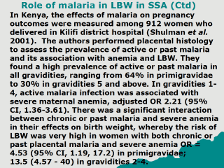 | The possible impact of placental malaria infection on infant mortality through reduced birth weight was modeled by analyzing several studies (Guyatt et al. 2001). The authors found that the proportion of LBW associated with infected and uninfected placentas for all-parities (primigravidae and multigravidae) was higher in those with infected placenta than in those without. |