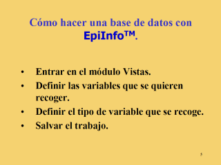 analizarlos. Un registro es un grupo de datos que corresponden a un individuo Un campo o variable es el valor que toma una característica concreta en ese registro. Para hacer una base de datos debemos decidir que variables queremos recoger y de qué forma las recogemos. Posteriormente se realizará la entrada de datos. Y posteriormente se efectuará el análisis. |