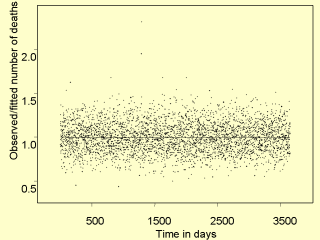 | This graph shows that the cyclical variations in the original mortality time series have been removed. There are two days in which mortality was very high (~1500 days), although we did not determine the reasons for this. |